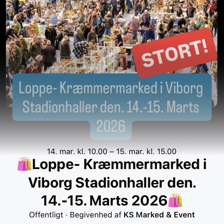 i weekenden d 14 -15 marts 2026 vil du kunne finde os i Viborg Stadionhal fra kl. 10 - 15.00 hvor KS marked holder deres store loppe-kræmmermarked.